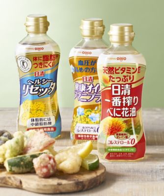 機能性表示食品「健康オイルアマニプラス」と特定保健用食品「ヘルシーリセッタ」、栄養機能食品「一番搾りべに花油」。さまざまなお料理に使いやすい健康オイルをセットにしてお届けします。