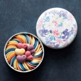 シャポンを代表するアガーツは、宝石の瑪瑙(めのう)を意味しています。瑪瑙のように鮮やかなデザインは、シャポン自らのデザイン。箱も同様に鮮やかな色合で、パリジェンヌに絶大な人気を誇るブランド。ホワイトチョコレートに直接プリントしているので、そのまま食べることができます。中はさくさくのプラリネ。