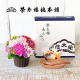 羊羹の賞味期限は製造日より常温で31日以上。直射日光・高温多湿を避けて常温保存してください。生花はお手入れしやすいスタンディングタイプで、花瓶いらず!
