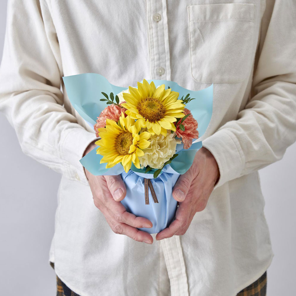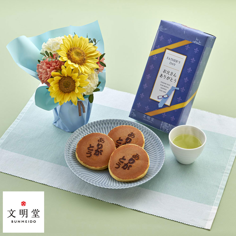 「敬慕」「憧れ」の花言葉を持つひまわり。太陽のように明るいひまわりは、見ているだけで心が温かくなります。そんなひまわりを、長きに渡りフラワーギフト製作に携わる、<日比谷花壇>のトップデザイナー・西澤真実子さんが、丁寧に、そして愛情を込めてデザインしました。スタンディングタイプのブーケは、花瓶いらずで手軽に飾れるのが魅力。さらに、北海道産小豆を使用したみずみずしい粒あんを、ふんわりとした皮で包んだ、<文明堂東京>の月三笠。優しい甘さが、お父さまの心を癒します。普段、お仕事を頑張ってくれているお父さまに、日頃の感謝と尊敬の気持ちを込めて、最高の笑顔を贈りませんか。※誠に勝手ながら、6月13日(金) →15日(日) の期間のお届けにつきましては、大変混雑することが予想されます。商品のお届けが遅くなり夜間となる場合がありますこと、あらかじめご了承くださいませ。