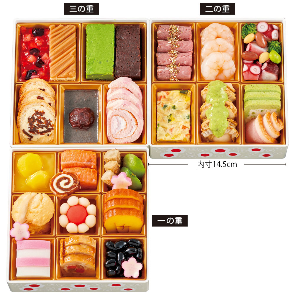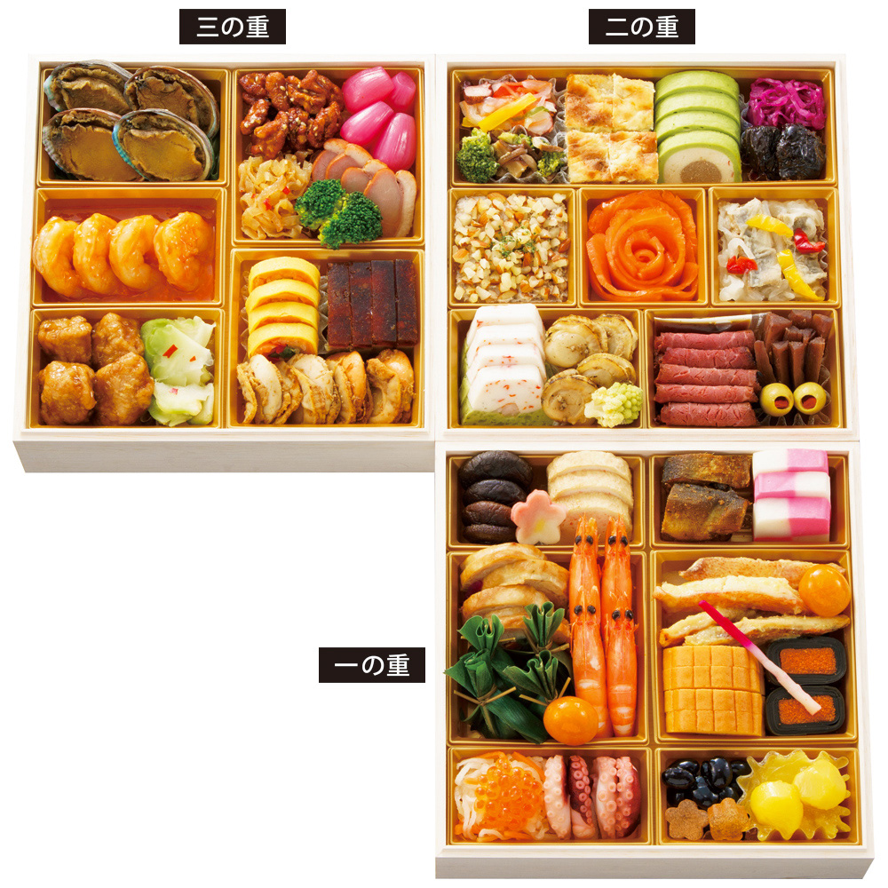 和のお正月料理、洋風オードブル、中華料理を少量ずつ詰めたミニサイズの三段重です。※オンラインストア・タカシマヤ通信販売のみの承りとなります。(高島屋各店でのお取り扱いはございません。)