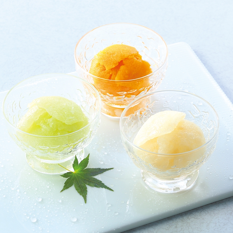 みずみずしい果実の風味を生かした涼菓。凍らせてしゃーべっと、冷やしてぜりぃ、二通りの味わいをお楽しみいただけます。