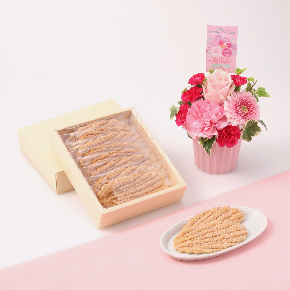 「ウエスト」人気のリーフパイ詰合せと、ピンクの優しい色合いのアレンジメントフラワーを組合せ。「母の日」ならではの組合せギフトです。