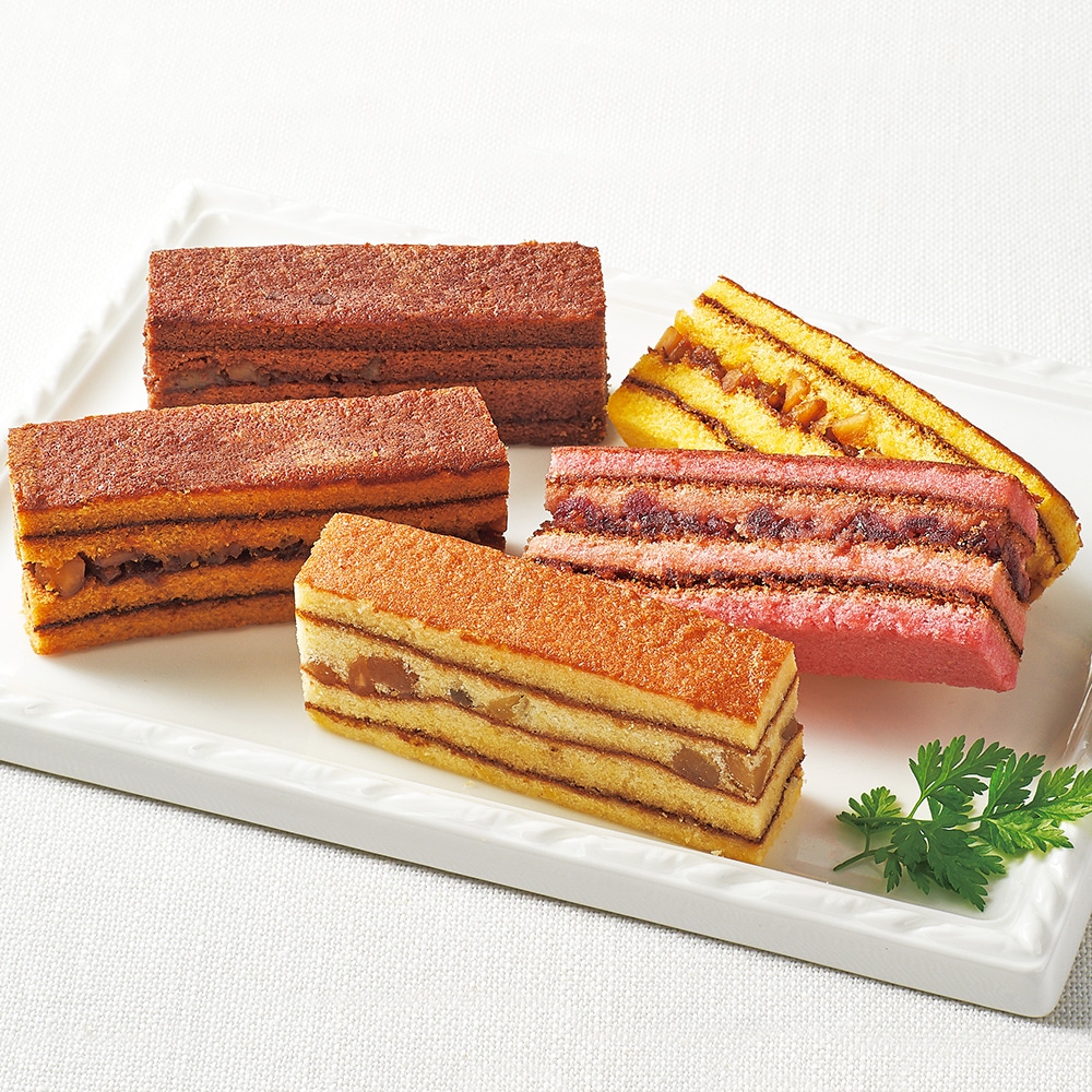 食べやすいスティックタイプのバウムクーヘン5種。相性の良いナッツやドライフルーツをはさみました。