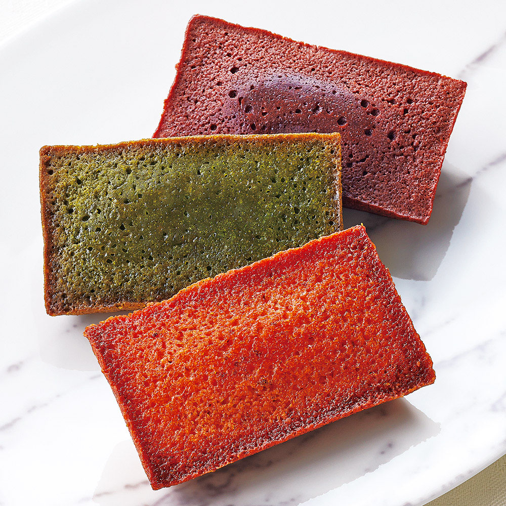 しっとり焼き上げたフィナンシェ。香ばしいヘーゼルナッツ、濃厚なチョコレート、ほろ苦い抹茶の3種類の詰合せです。
