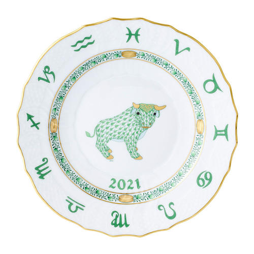 西洋の黄道十二宮と東洋の干支が組み合わされたヘレンドのイヤーズプレート。2020年から始まった新しい干支シリーズは、世界で古くから伝わるお話をテーマにヘレンドの若手で才能豊かなアーティストJudit Savanyu(ユディット・サバニュー)によりイマジネーション豊かに紡がれる十二支のものがたりの世界です。第二作目のうしは、”花の香りを嗅ぐのが大好きなうし”のお話からイメージされ創作されました。