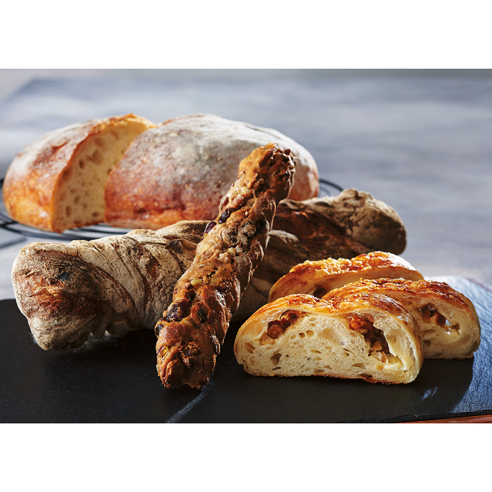 グルマンの「薪焚き石窯」は、「外はカリッと中はしっとりもちもち」の食感です。小麦やバターなど素材の香りが残ります。「石窯クロワッサン」は発酵バターを使用し、全粒粉配合で、風味豊か。石窯焼きすることでザクっとした食感に。「旨味チーズ」はもちもち生地にチーズがとろり。3種のチーズ(グリエール・エダム・カマンベール)を入れました。「ドイツの黒い森」はドライフルーツやナッツが入ったライ麦パン。噛む程に生地の旨味が深く味わえます。クリームチーズやジャムなど塗るのもおすすめ。「パリスエッテ」は小麦本来のおいしさを引き出しました。表面はハード、中はもっちり。噛みごたえのある味わい深さで、チーズフォンデュにもおすすめ。サンドイッチやトーストでもお楽しみいただけます。