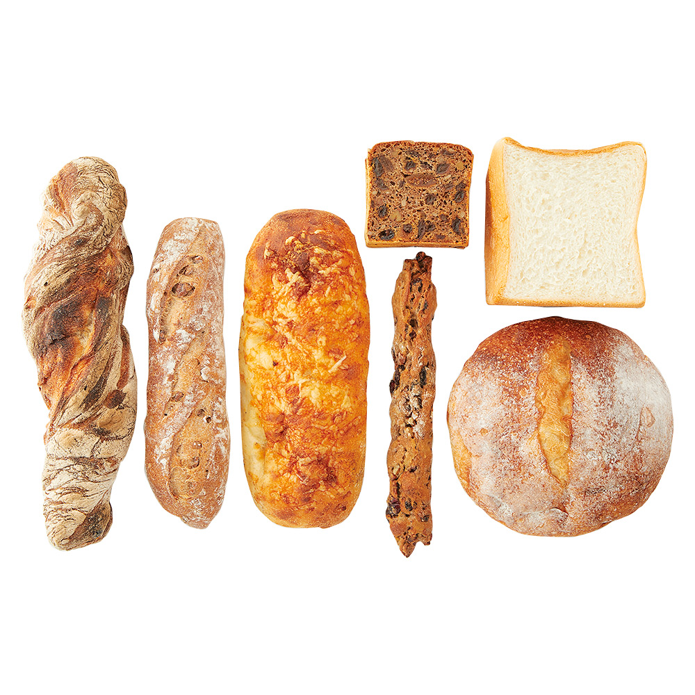 石窯パリスエッテ醍醐味、石窯旨味チーズ(ペッパーナッツ)、ブール108、北の大地食パン(1/2)、ルヴァンスティック(レモン入り)、ドイツの黒い森、クルミバケット 計7種