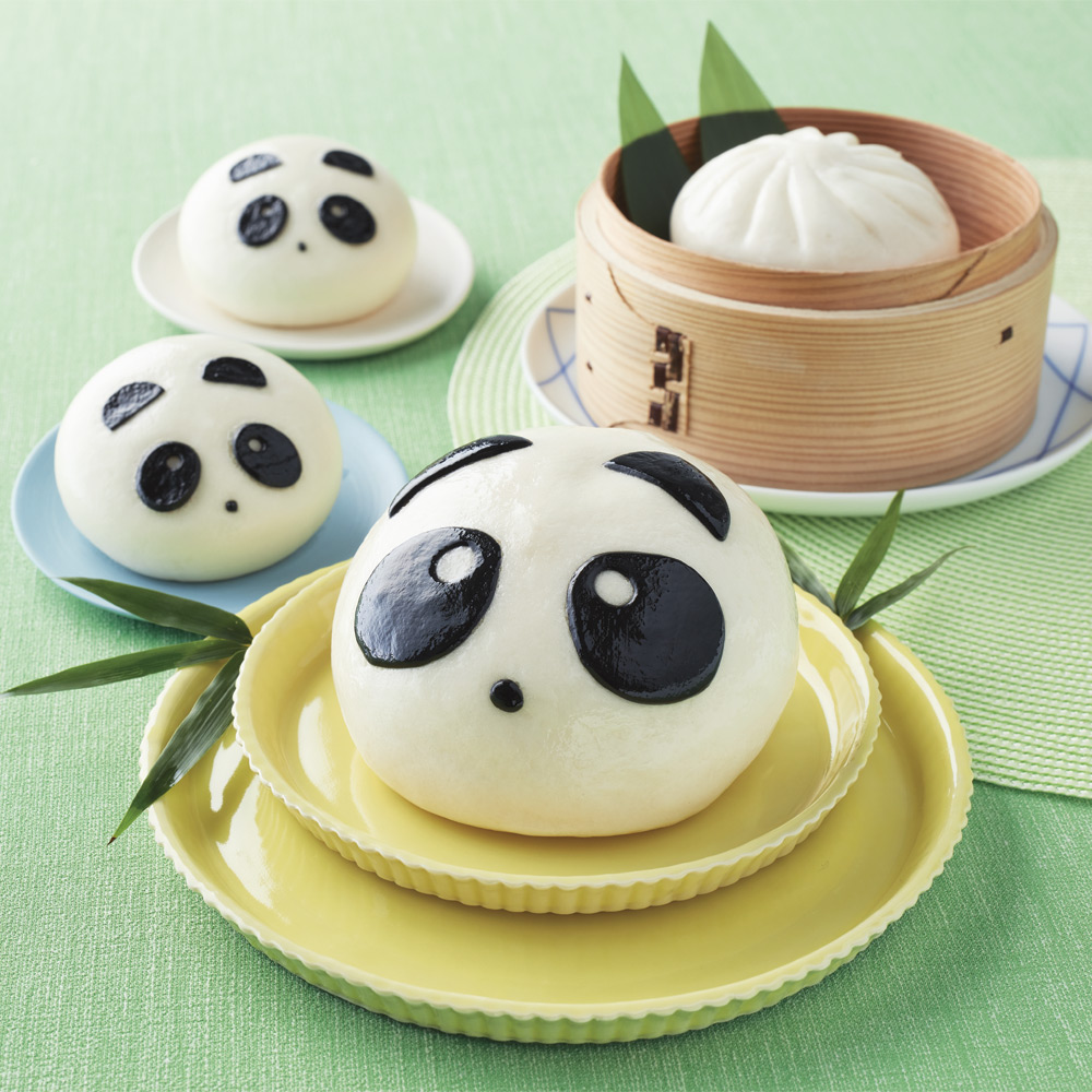 職人が一つひとつ手作りしたパンダの顔が可愛い、こし餡入りとカスタード入りの中華まん。人気の肉まんとセットに。