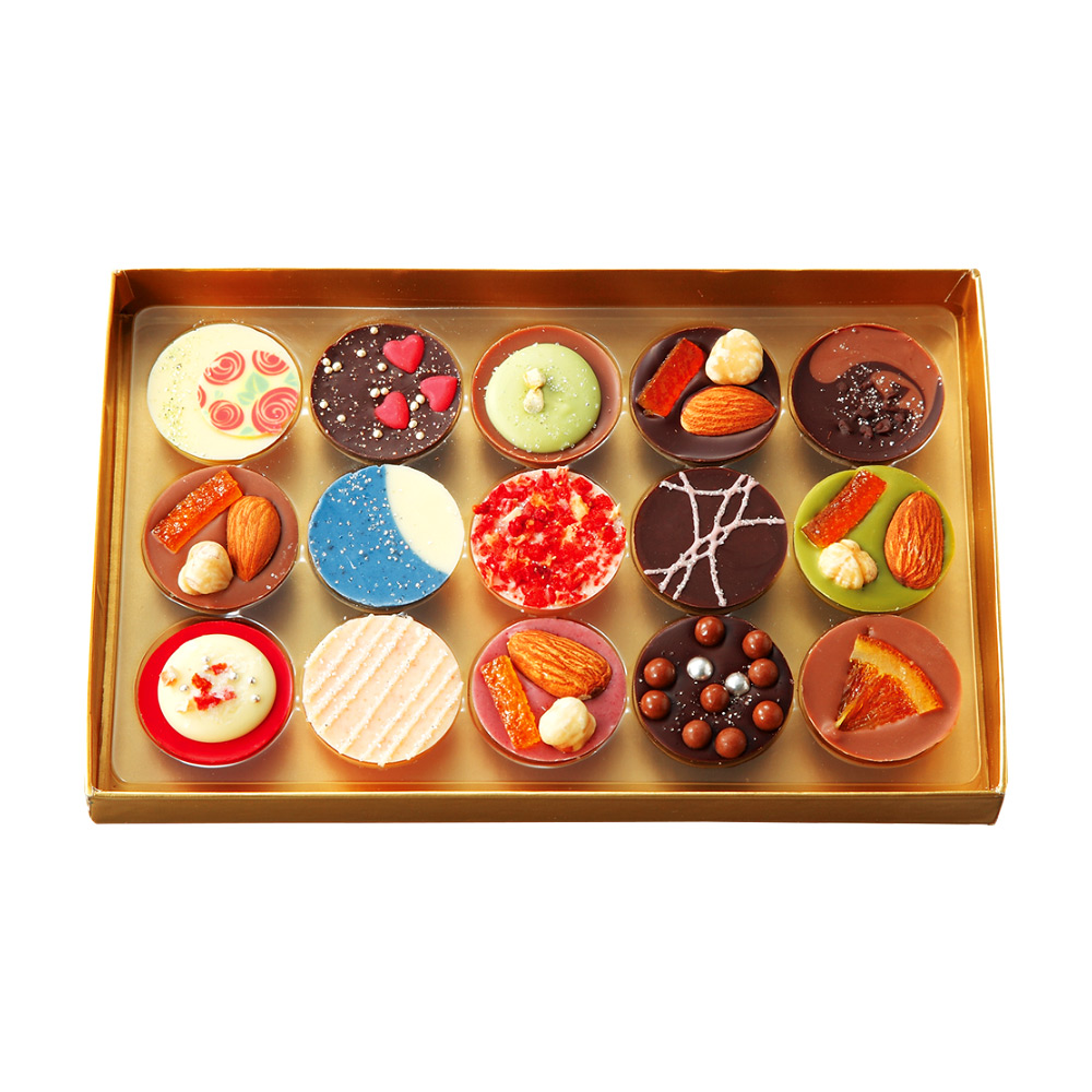15枚の個性豊かなミニサイズ板チョコレートは、厳選された原材料とショコラティエの手作り技術で仕上げられています。パッケージも上品で、贈り物としても喜ばれるデザインです😊。