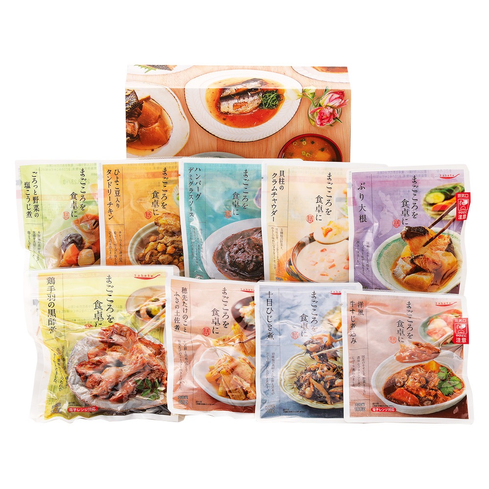 穂先たけのことふきの土佐煮80g、十目ひじき煮70g、ゴロっと野菜の塩糀煮120g、洋風牛すじ煮込み100g、ひよこ豆入りタンドリーチキン70g、ぶり大根130g、鶏手羽の黒酢煮165g、ハンバーグデミグラスソース150g、貝柱のクラムチャウダー160g 計9点