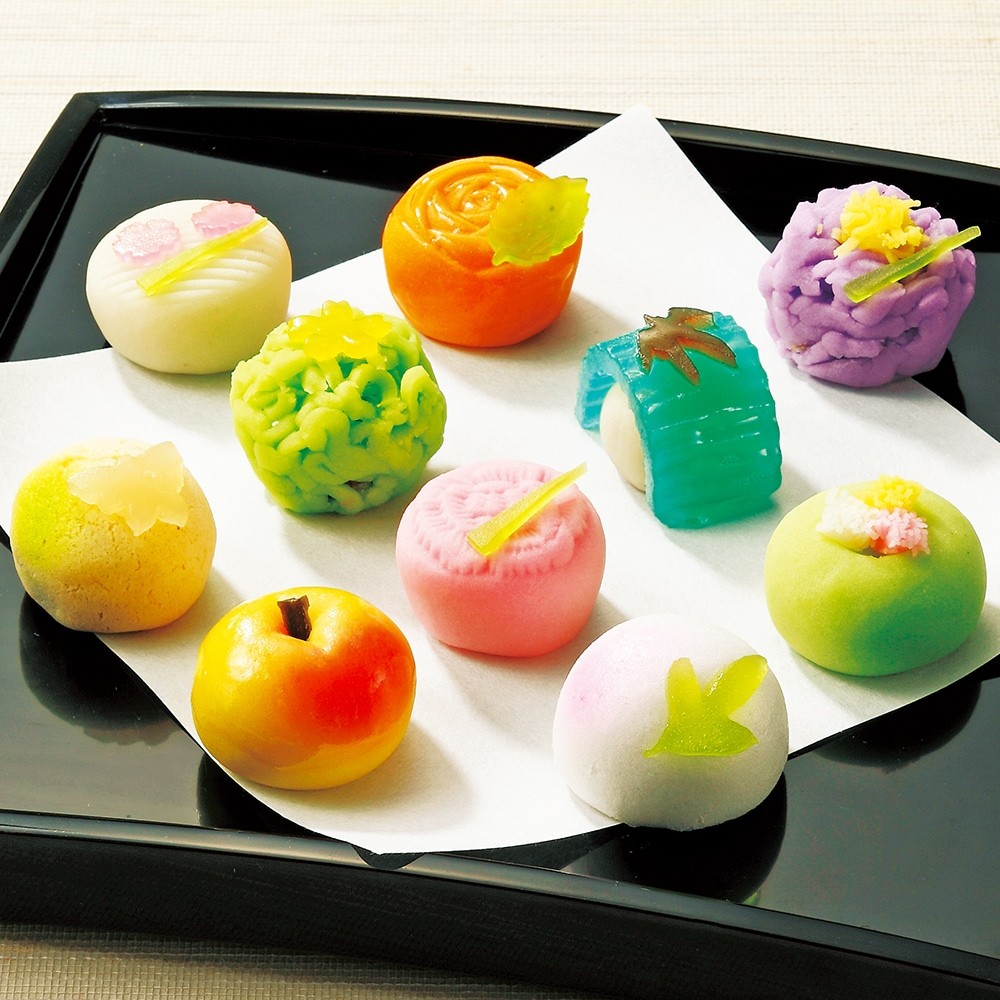 三色すみれ、カーネーションをはじめ、季節感あふれる10種のモチーフを表現した、上品な味わいの上生菓子です。