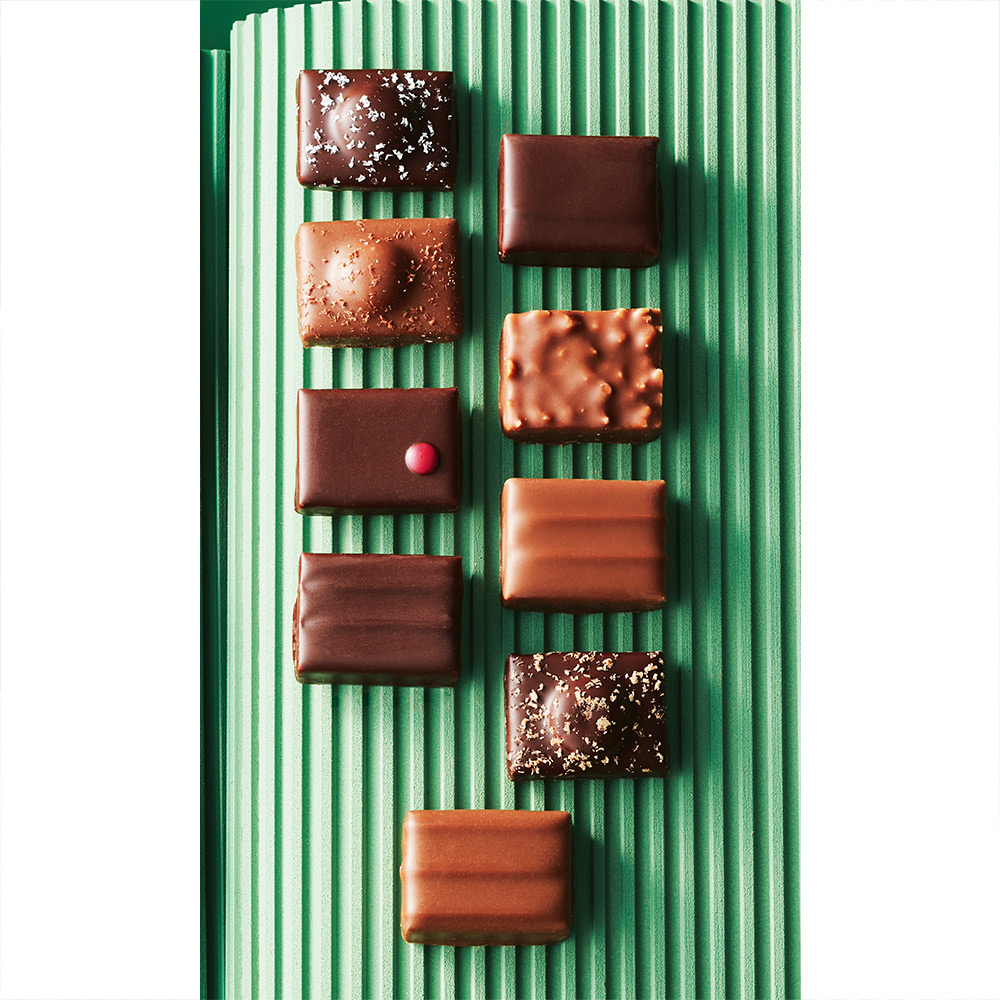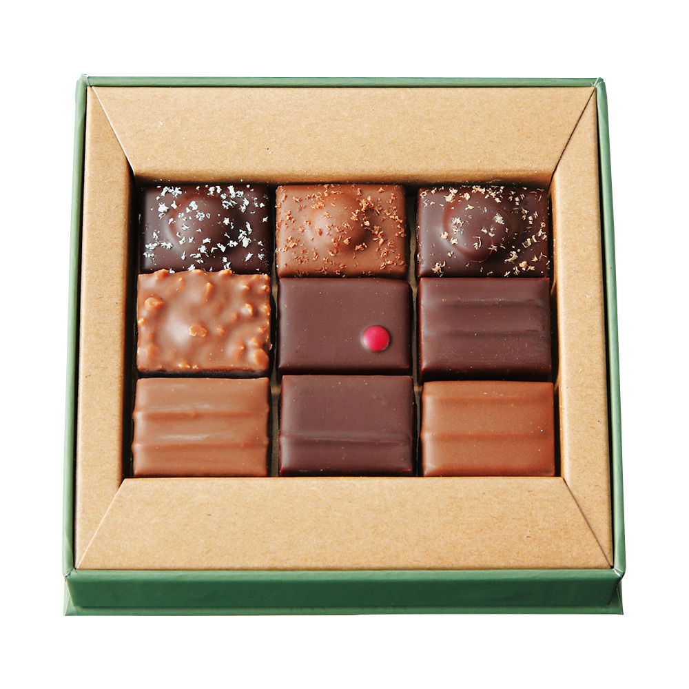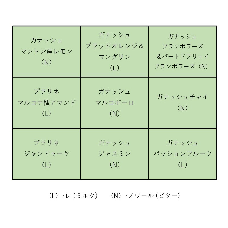 9種計9個入(ガナッシュマントン産レモン、ガナッシュブラッドオレンジ&マンダリン、ガナッシュフランボワーズ&パートドフリュイフランボワーズ、プラリネマルコナ種アマンド、ガナッシュマルコポーロ、ガナッシュチャイ、プラリネジャンドゥーヤ、ガナッシュジャスミン、ガナッシュパッションフルーツ)