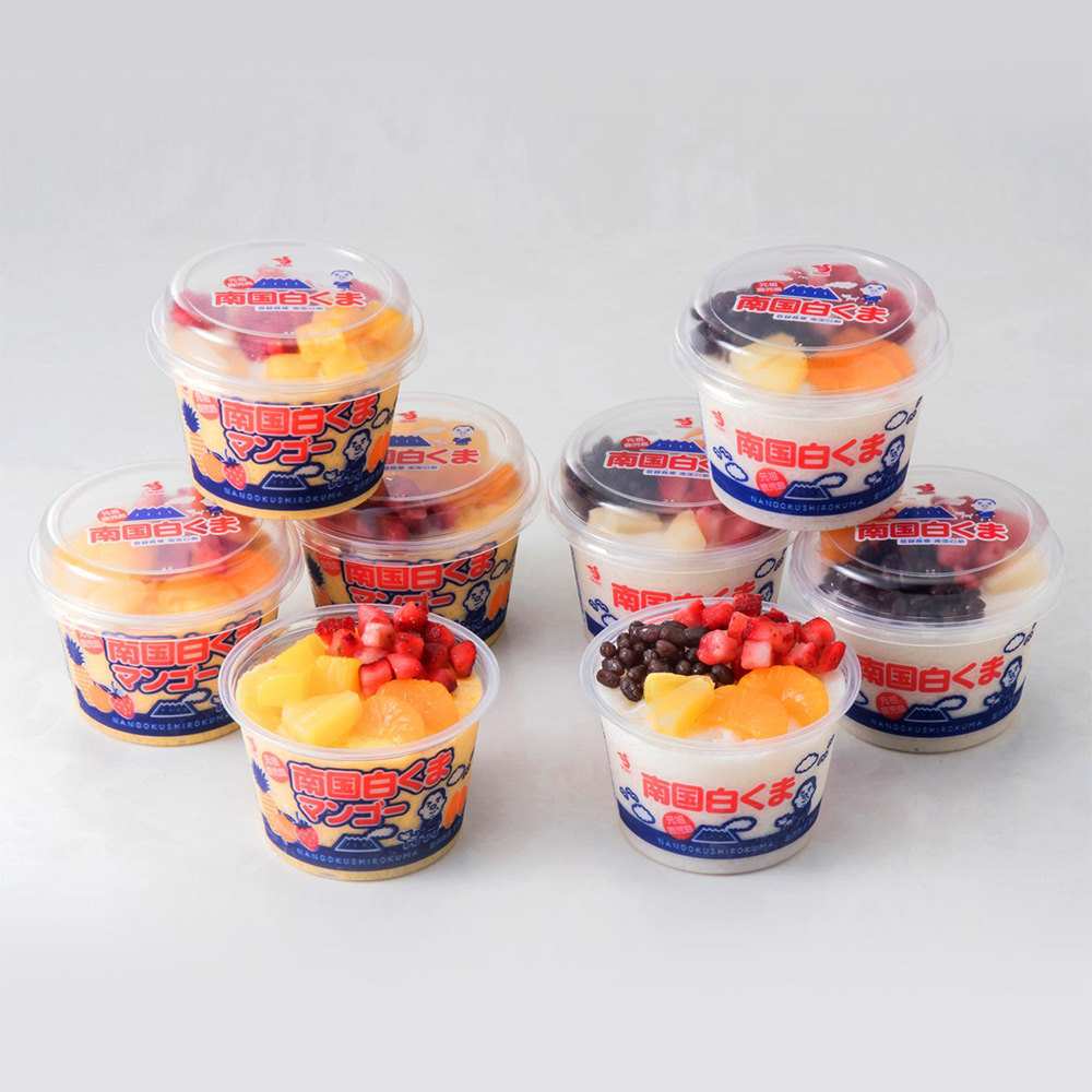 練乳の風味、甘さに調和するフルーツ等(みかん・パイン・小豆・いちご)をトッピングした個食タイプ(180ml)の「南国白くま」と、マンゴーピューレを混ぜ込んだ練乳かき氷に、甘さに調和するフルーツ等を彩り良く盛り付けた個食タイプ(180ml)の「南国白くまマンゴー」の2種類を詰め合わせたセットです。