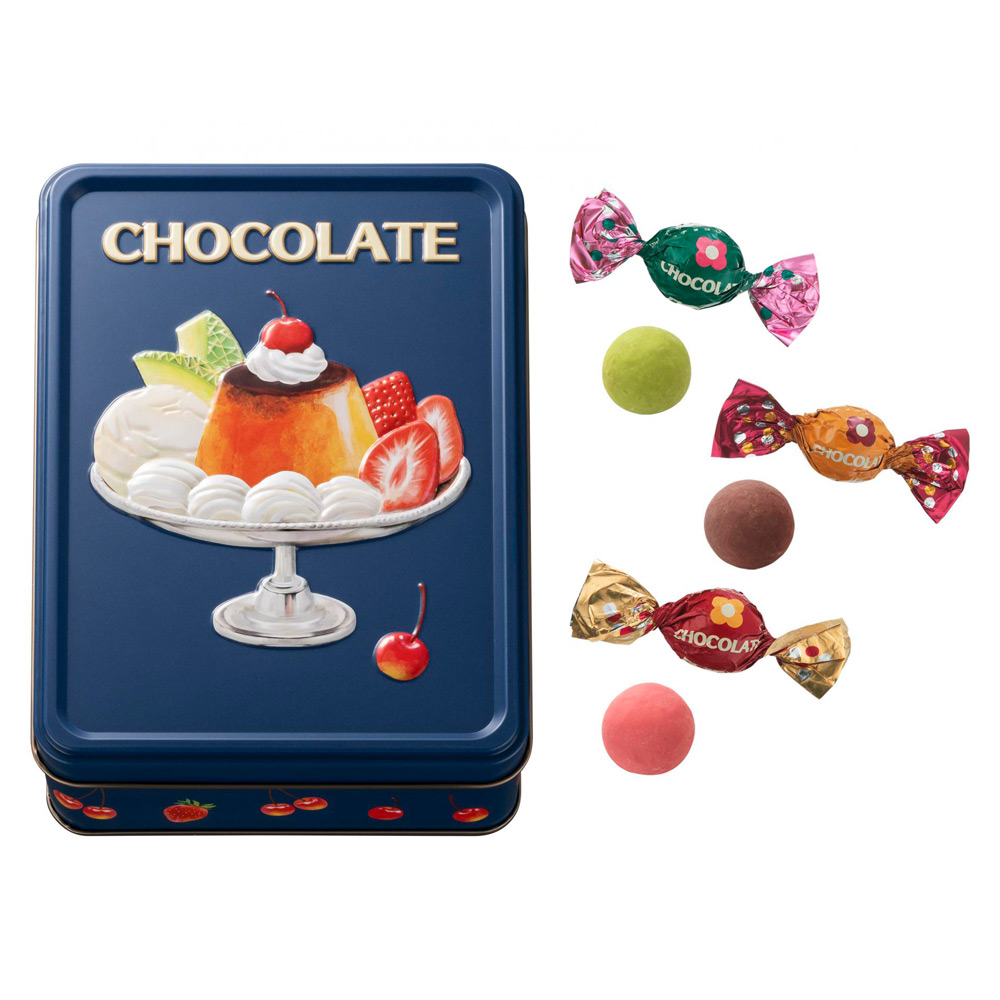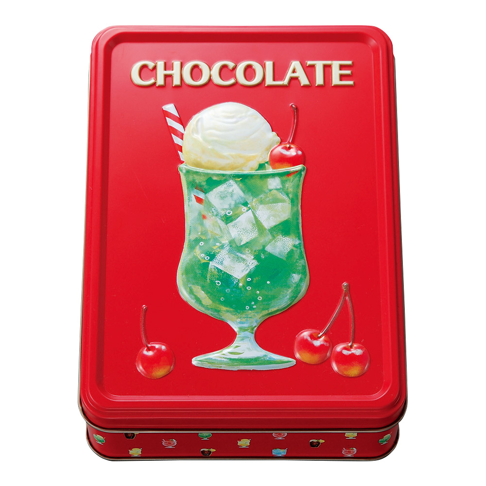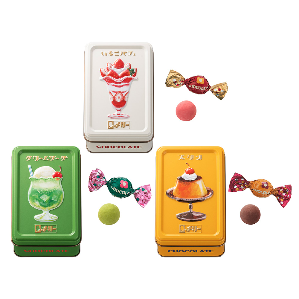 クリームソーダ、プリン、いちごパフェ、3種類の風味のキャンディインチョコレートの詰め合わせ。<ポイント>缶のフタにはエンボス加工を施し、イラストはぷっくりと立体的に盛り上がります。