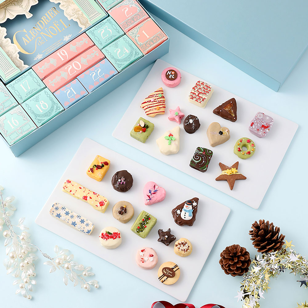 箱を開けると、そこは、クリスマス舞踏会のステージ。ステージを囲む小箱には、ひとつひとつ、異なるクリスマスモチーフのスイーツが、詰められています。ホワイトチョコや、ダークチョコをそれぞれにまとった、サクサク食感のラスクやクッキーは、明日の分まで食べてしまいたくなるような美味しさです。心ときめく、クリスマスまでのカウントダウン。※トッピングの種類はランダムです。お選びいただけません。