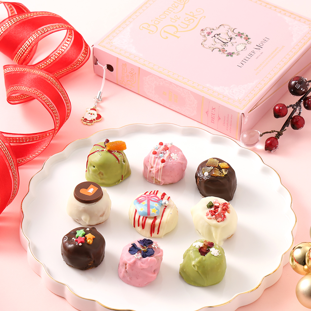 サクサクパイをラスクに焼き上げ、濃厚ショコラをトロリとまとわせました。お花やフルーツ、クリスマスモチーフのデコレーションで心躍るキュートなスイーツの誕生です。ひと口サイズのショコララスクと、クッキーは食べやすさも魅力。ブック型のパッケージにおさまり、プレゼントにおすすめです。※トッピングの種類はランダムです。お選びいただけません。