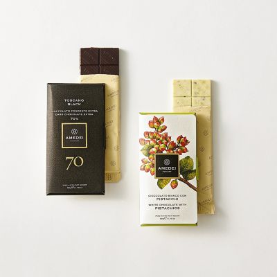 1990年創業のイタリアのチョコレートブランド。南米のカカオ農園の土造り・カカオ栽培からチョコレートになるまでの全工程を自社管理のもと行っています。カカオの特性を活かした極上の味わいと口どけが特長です。アメデイの原点であるトスカーノブラック70%と人気のピスタチオホワイトのセットです。