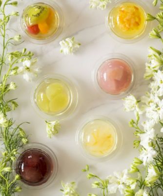 各地から厳選したフルーツの果汁と果肉を使った、色とりどりに輝くゼリー。