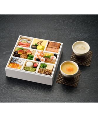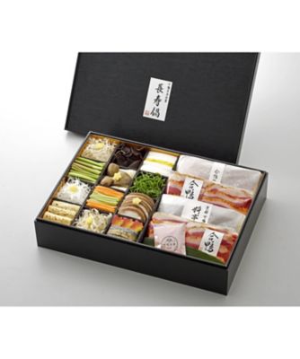 小鯛笹漬け、すだち、蟹の甘酢漬け、厚焼玉子、合鴨燻製、帆立ひもたらこ雲丹和え、粟麩煮、飛竜頭煮、椎茸煮、巻き湯葉、青唐ひたし、花麩煮、さんど豆、海老煮、子持ち烏賊、カレイの西京焼き、黒豆、小川巻き、しめ鯖、なます、いくら醤油漬け、菊花、団子、わらび餅、黒蜜、肉豆腐(牛しぐれ煮・揚げ豆腐・葱)、すり流し(人参・かぶら)