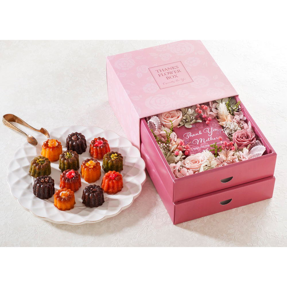 大切なお母さんに、スイーツとお花の両方を贈りたい方にぴったり!華やかなプリザーブドフラワーと上品なカヌレで、感謝の気持ちをしっかり伝えられます。