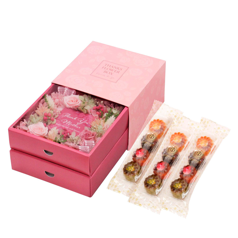 上段は華やかなプリザーブドフラワーボックス。下段はフレンチの人気店「レ ロジェ エギュスキロール」の一つ一つ丁寧にトッピングした4種のミニカヌレをセットしました。母の日に、スイーツとプリザーブドフラワーが一緒に贈られる嬉しいギフトです。母の日のメッセージラベルをつけてお届けいたします。