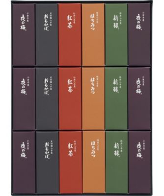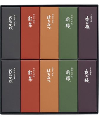 内容量 夜の梅(小倉)×6本、おもかげ(黒砂糖入)・新緑(抹茶入)・はちみつ(蜂蜜入)・紅茶(紅茶入)×各3本、各50g